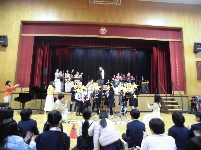 「ルージュ伝言」で手拍子ゲームを行ったり、児童参加の「つばさをください」の歌唱、演奏。