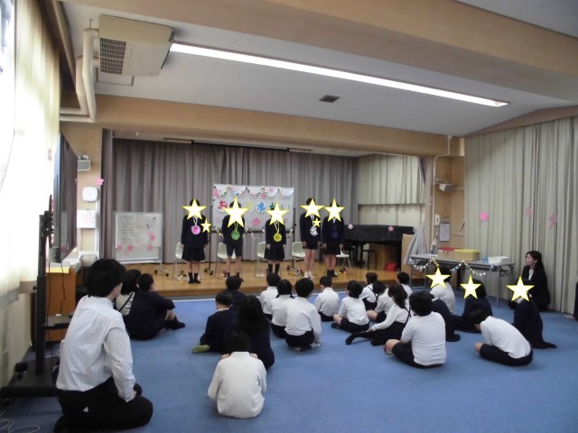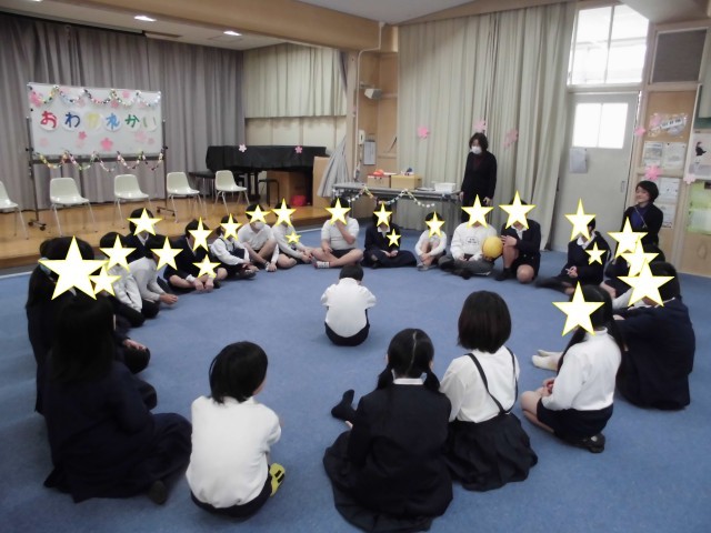 6年生へのプレゼント、在校生からのメッセージ、6年生の別れの言葉、みんな遊びをしました。