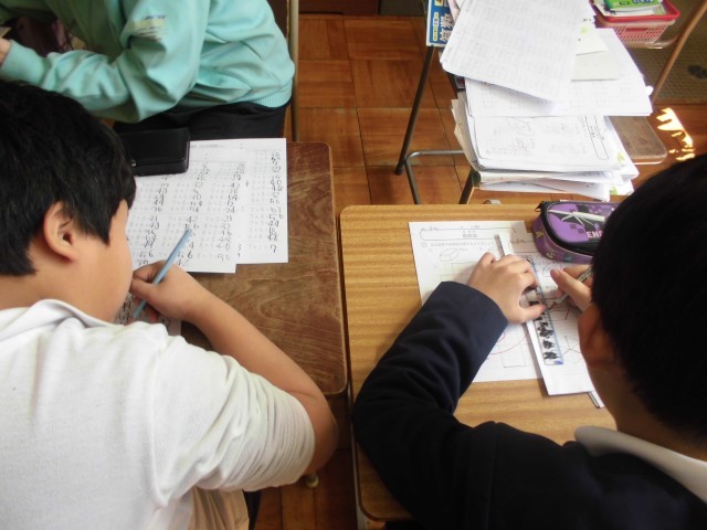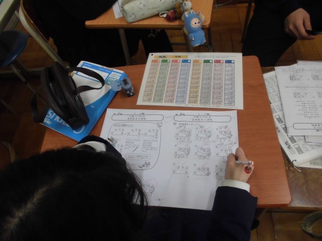 算数で、ドリルの学習、九九、3けた×1けたの筆算、展開図の学習をしました。