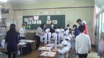 4月9日(火)いよいよ今日から給食が始まりました。今日の給食は、入学祝い献立で6年生のおにいさん、おねえさんが手伝ってくれました。