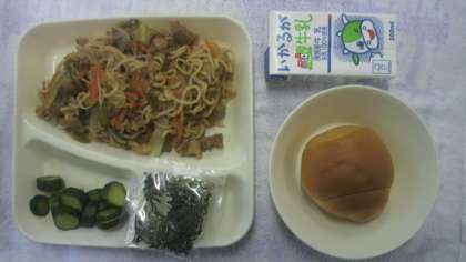 4月10日(水)給食の献立は、焼きそば・きゅうりのしょうがづけ・パン・牛乳でした。