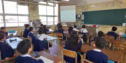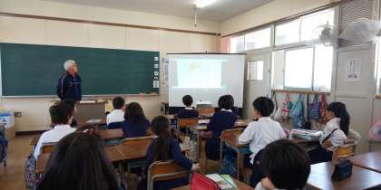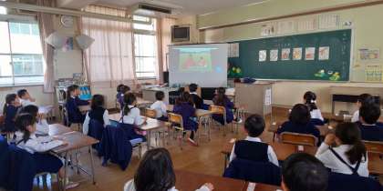 橘小学校では、毎週火曜日・金曜日15分間という短い時間ですが朝の時間を活用し、英語学習を全学年で取り組んでいます。朝から元気な声で「ABCDEFG〜・・・」と楽しそうな歌声が聞こえてきました。