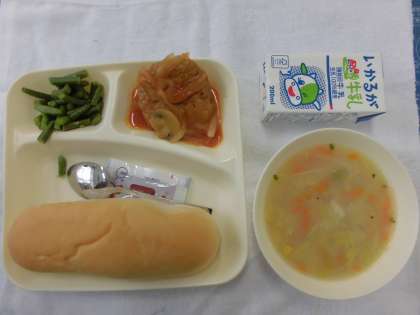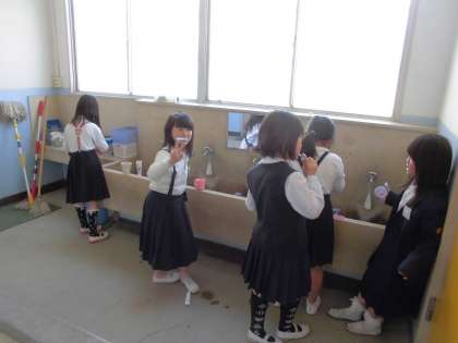 4月17日(水)給食の献立は、煮こみハンバーグ・コーンスープ・さんどまめのサラダ・いちごジャム・パン・牛乳でした。2枚目の写真は、2年生が給食後、歯を磨いているところです。今日の保健委員会の放送で、「60才になった時、20本の歯が残っているように、歯を大切にしましょう。」と代表委員の児童が言っていました。