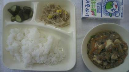 4月22日(月)給食の献立は、マーボーどうふ・きゅうりの甘酢づけ・もやしとコーンのごまいため・ごはん・牛乳でした。