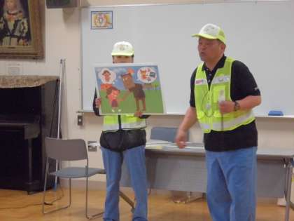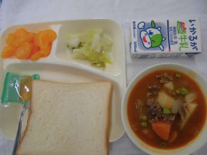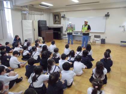 4月26日(金)給食の献立は、ビーフシチュー・キャベツのピクルス・みかんのかんづめ・りんごジャム・パン・牛乳でした。2枚目、3枚目の写真は、今日の3限目に多目的室で行われた1年生の交通安全教室の様子です。