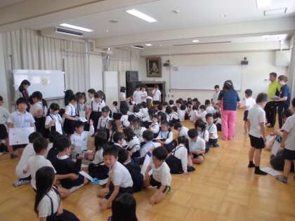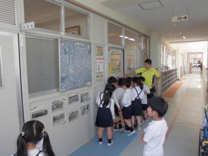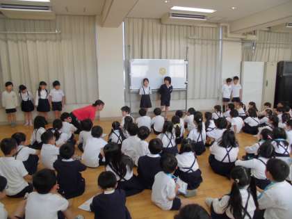 5月16日(木)2限目に、1、2年学校たんけんを行いました。2年生のみんなが、それぞれグループに分かれて、1年生を連れて学校の中を歩き回りました。2枚目の写真は、多目的室で行われた「はじめの会」の様子です。かんりさぎょうしつ、ほけんしつ、こうちょうしつ、しょくいんしつ、じむしつ、ぱそこんしつ、りかしつ、としょしつ、かていかしつ、おんがくしつ、ずこうしつ、ぐりーんひろばの合計12か所を回ってスタンプを集めました。各場所には、クイズ(その場所に関連のある問題)が貼られていました。校長室では、校長先生が1年生全員にひとりひとりに声をかけ笑顔でスタンプをおしてくれました。