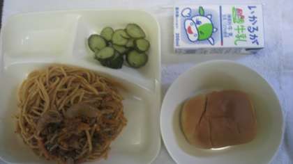 6月3日(月)給食の献立は、スパゲッティミートソース・きゅうりのバジル風味サラダ・パン・牛乳でした。