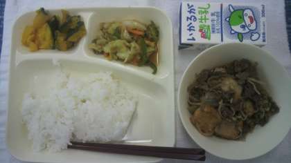 6月4日(火)給食の献立は、すき焼き煮・焼きかぼちゃ・野菜のそぼろいため・ごはん・牛乳でした。