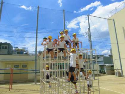 9月になっても、暑い毎日が続いています。子どもたちは、黄色の帽子をかぶって熱中症にならないように気をつけながら遊んでいます。(ジャングルジム付近の様子)