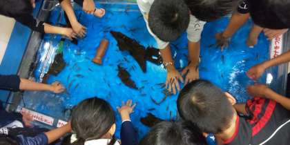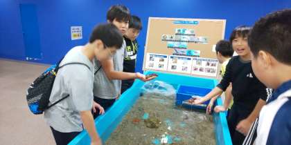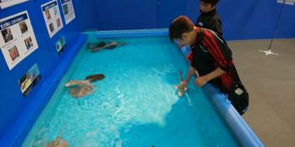 「生き物にさわれるよ」コーナー。ドクターフィッシュなど。