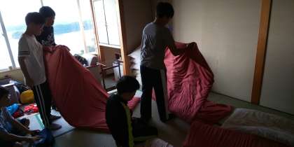 6:30起床で布団を整理しています。健康観察をし、室長が先生に班の健康状態を報告します。