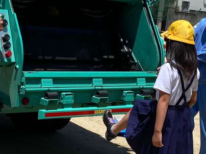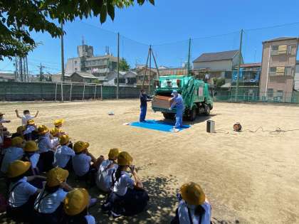 パッカー車の回転ドラムを停止させるボタンは3か所あることを学習しました。写真の女子は蹴っているのではありません。停止ボタンを押しているのです。最後は粗大ごみをパッカー車に入れて、大きな音にみんなびっくり!充実した体験学習でした。南部環境事業センターの皆さん、ありがとうございました。