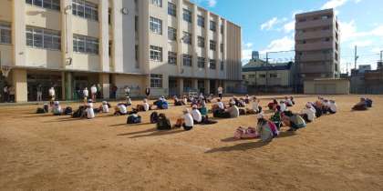 写真は出発式の様子です。保護者の皆さま、見送りありがとうございます。