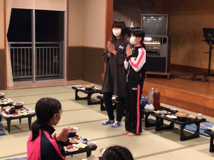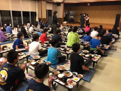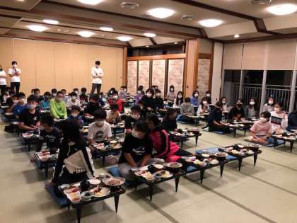みんなそろって大広間での食事です。でもコロナ対策で同じ方向を向いて静かにいただきます。