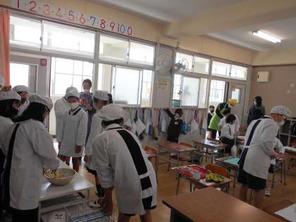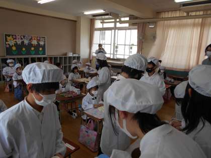 1年生はじめての給食です。 今日の献立は、カツカレー・フルーツ白玉・牛乳です。