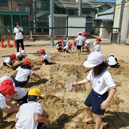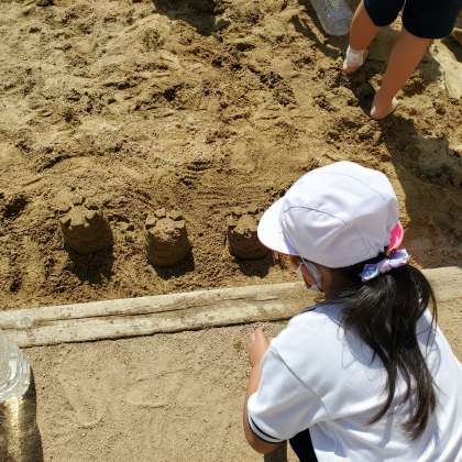 運動場の砂場で、川や山、お城などを作りました。ペットボトルやバケツを上手に使いながら、友だちと協力して造形あそびを楽しんでいました。