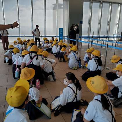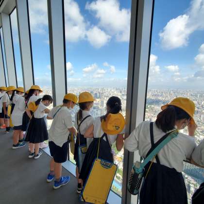今日はあべのハルカスへ社会見学に来ました。60階の展望台から大阪の様子を調べます。お天気にも恵まれ、遠くの景色もよく見えます。東西南北の景色を班ごとに見て、ワークシートにまとめます。