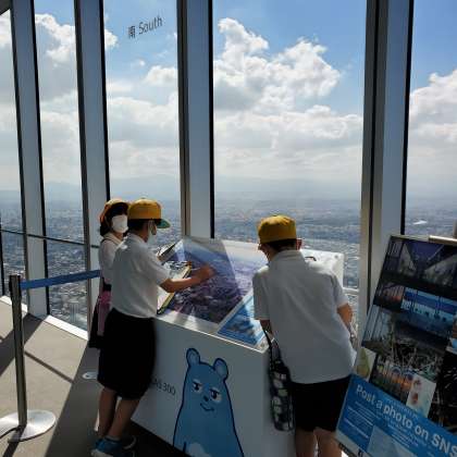 みんなで橘小学校を探しています。天下茶屋中学校はよく見えましたが、橘小学校は窓が4枚ほどしか見えませんでした。