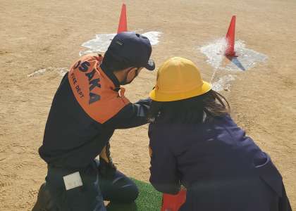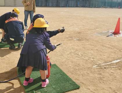 赤いコーンを火に見立てて、水消火器で火を消す練習をしました。