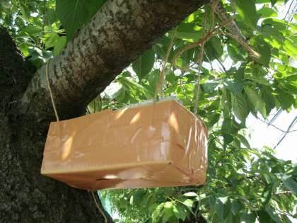 思案の結果、巣箱のようなものを作り、巣があると思われる木に設置することにしました。管理作業員さんに手伝っていただき、写真の様な状態でしばらく様子をみることになりました。無事に育ってくれたらいいなあ。