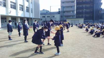 たてわり班から、卒業生一人一人へ、メッセージカードが贈られ、卒業生からのお返しとして、家庭科の学習で作成した雑巾を渡しました。卒業生は優しいまなざしでカードを受け取っていました。