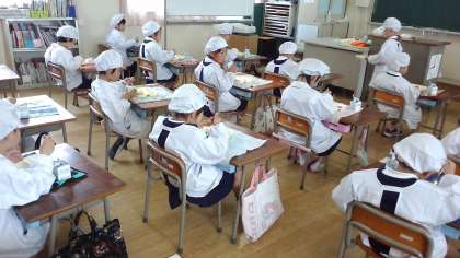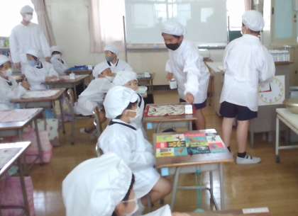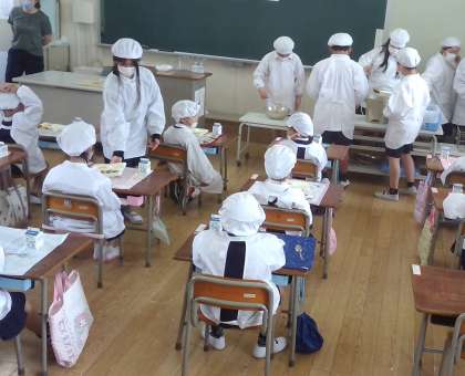 1年生は今日が初めての給食でした。6年生に用意を手伝ってもらい配膳も上手にできました。みんなおいしそうに食べていましたよ。