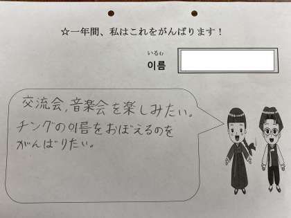 5月17日の民族学級では、イルム(名前)を書く練習をしました。何も見ずに書ける子どももたくさんいました。その後、これから1年間がんばりたいことを一人ずつ発表していきました。自分のイルム、大切にしていきましょうね。