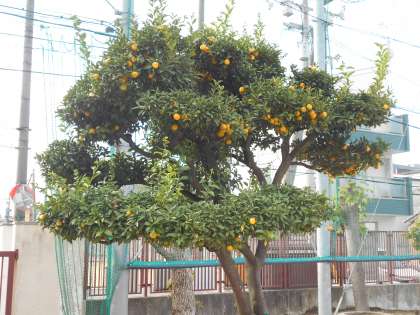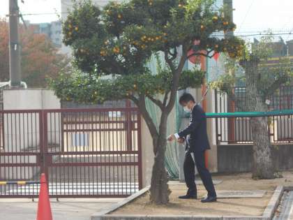全校朝会のあと、校長先生が橘の木のところでいろいろと調べているようでした。橘の木には見事な実がなっているので、何か楽しい活動を考えているのかもしれませんね。