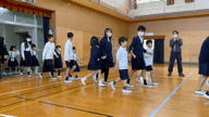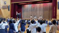 6年生に手を引かれ、全校児童から万雷の拍手を浴びて1年生が入場しました。そのあと、じゃんけんゲームで盛り上がり、6年生から塗り絵のプレゼントをもらいました。最後に1年生で体験授業を受けている児童を校長先生から紹介していただきました。