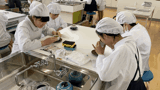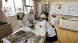 5年生が家庭科室で、はじめての調理実習に取り組んでいます。