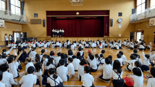 幕の後ろに隠れている先生に集会委員会の児童が質問をして、どの先生かを当てるクイズです。中には声色を変えて話す先生もいて、子どもたちは楽しく考えながら、正解の発表でも大喜びしていました。