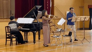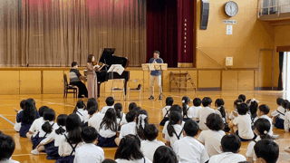 今回は、ヴァイオリンとオーボエ、ピアノの3つの楽器を使っての演奏でした。各楽器の紹介では、子どもがランダムに選んだ音階(ドレミ)を、その場で組み合わせ即興で演奏するという「神業」を披露していただき、教職員も含めて感嘆の声が上がりました。