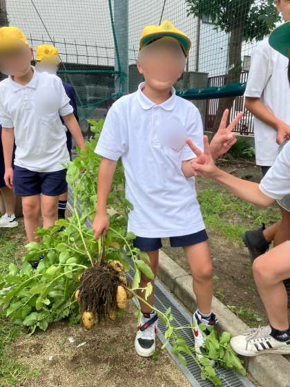 このジャガイモは、西成区長さんからいただいたもので、6年生が大切に育ててきました。収穫したジャガイモは、植物の光合成の確認など有効に学習に活用させていただきます。