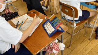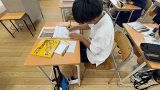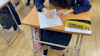 6年2組は美術科の授業でした。初級、中級、上級の塗り方を教えていただいたあと、早速3つのレベルの塗り方に取り組みました。上級編では、教室に点描の音が鳴り響いていました。