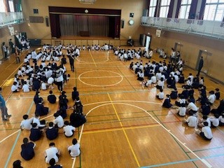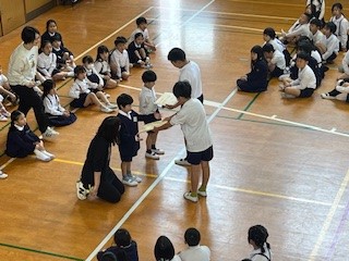 6年生に優しく手をつないでもらい、一緒に入場してきました。