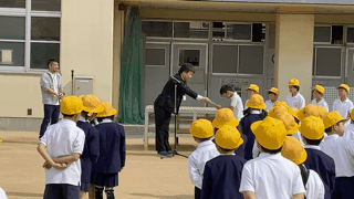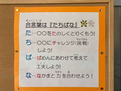 4月15日の全校朝会で、校長先生から「た・ち・ば・な」の合言葉の説明がありました。職員室前に掲示もされています。