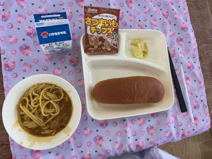 今日は、カレースープスパゲティー。お箸で上手につかめたかな?