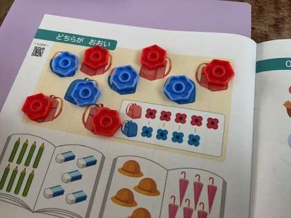 1対1(絵とおはじき、絵と絵など)対応させて、数の大小を調べたらいいんだということを活動を通して、学んでいる1年生でした。