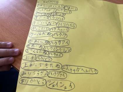 ありがとう、おりこうさん、いいよ・・などを中国語でどう発音するのかを自分で調べてまとめたとのことでした。