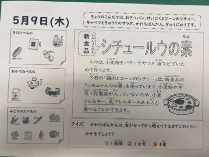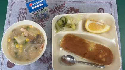 おさつパン、牛乳、鶏肉とコーンのシチュー、キャベツときゅうりのサラダ、河内ばんかん