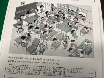 橘小学校でも、プリントを使いながら、どんなことがいじめにつながるのか一人一人考えました。