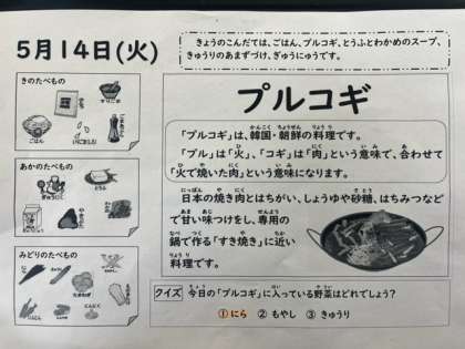 今日の給食には、韓国朝鮮の料理であるプルコギが出ました。