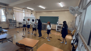今年の6年生は6人で、ほうきではいて、机を運んでなどの掃除を15分以内でします。担任の先生も一緒に頑張ってました。