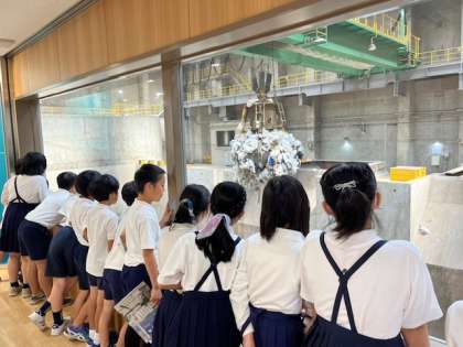 収集したごみを集めるプラットホームとごみを一時的にためるごみピットでは、ごみクレーンに感動している4年生。