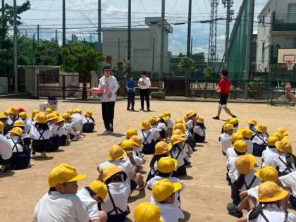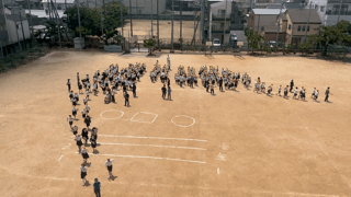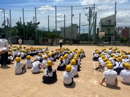 運動場へ避難しましょうという放送から、3分35秒で避難を完了しました。