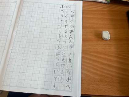 はじめ、中、終わりを意識して「がんばりたいこと」についての作文を書いたり、発表したりしています。