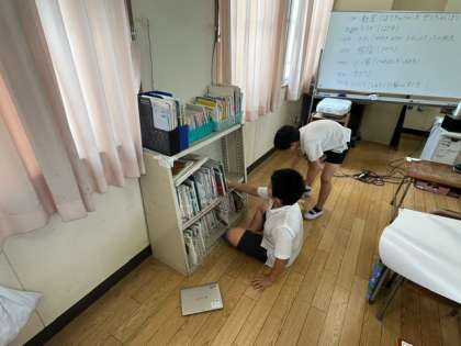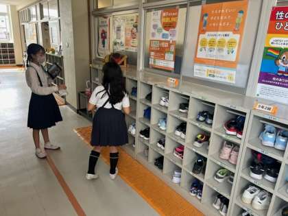 靴箱の掃除の仕方、本棚の整理、階段など、5.6年生がペアを組んで協力して撮影していました。