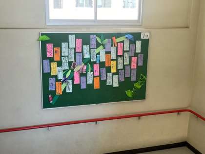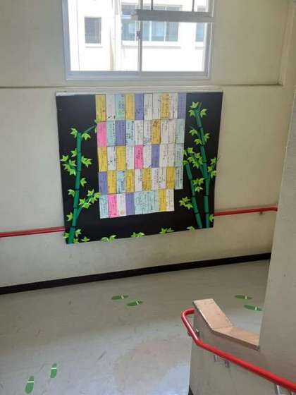 階段には、学年の七夕が掲示されています。暑い日が続いていますので、保護者の方も熱中症対策の上、お越しください。