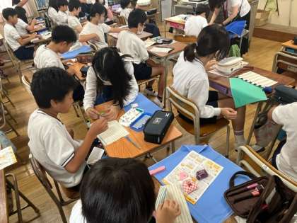 ポケットのできあがり線に合わせており、しつけ糸を使って縫い合わせました。困っている友達には、やり方を教えてあげていました。