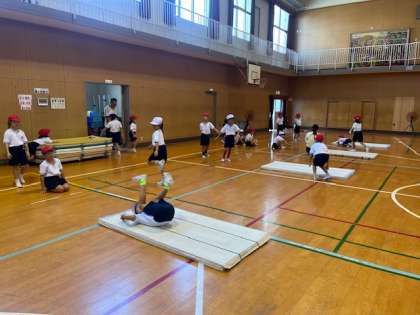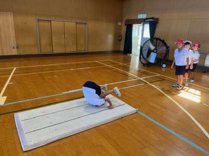 1年は、マットを使った運動遊びで、前まわりをしていました。